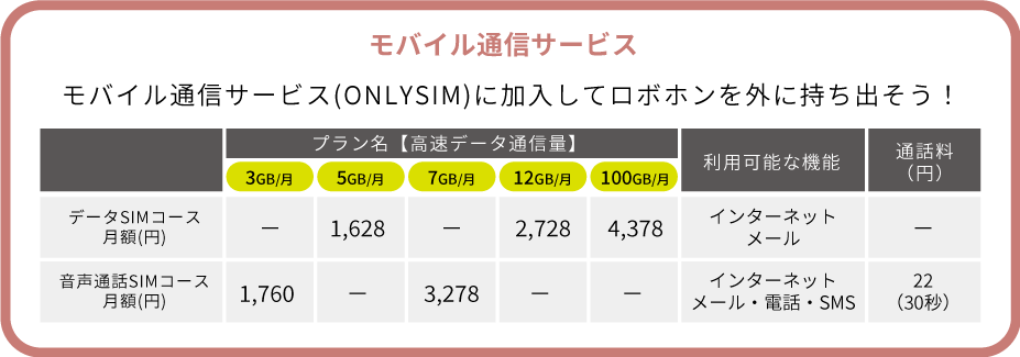 SIMカードを挿入することで電話やおしゃべり等が外出先でもできるようになります。ロボホン専用の「モバイル通信サービス」では、データ通信のみが使える「データSIM」と電話としての音声通話機能が使える「音声通話SIM」の2タイプをご用意しています。ロボホンによる音声通話をご利用になる場合は、「音声通話SIM」をお申し込みください。