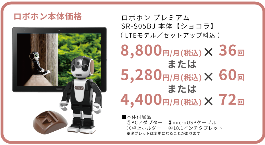 ロボホンの修理代金(技術料及び部品代)の100%及び、 通常使用による自然放置、偶然の事故(火災、盗難、紛失、破壊、落雷、水漏れ) で使用不能となった場合、ご購入時対象タブレットまたはプロジェクターをリファビッシュ品と 3,300円で交換します。 |