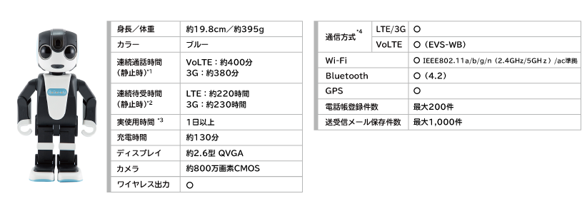 ※3 シャープが想定するロボホンの利用(カメラ、メール、会話、検索、電話など、約130分間/日の利用)があった場合(シャープ調べ)。実際の利用状況(サーボモーターを多く使用した場合など)によっては、下回る場合があります。